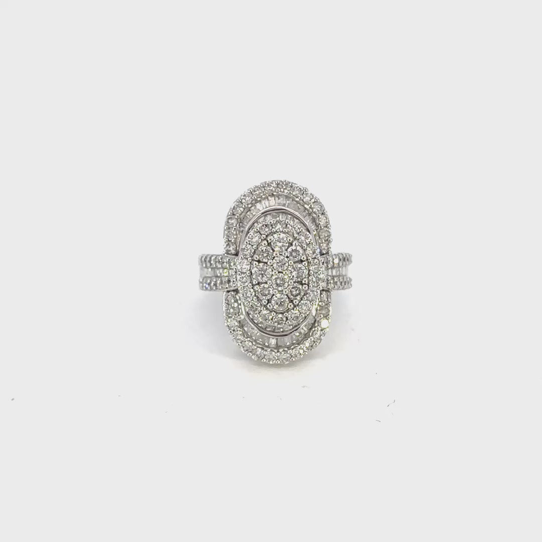 One 14K white gold 2.57 cttw. diamond oval cluster ballerina halo cocktail ring.