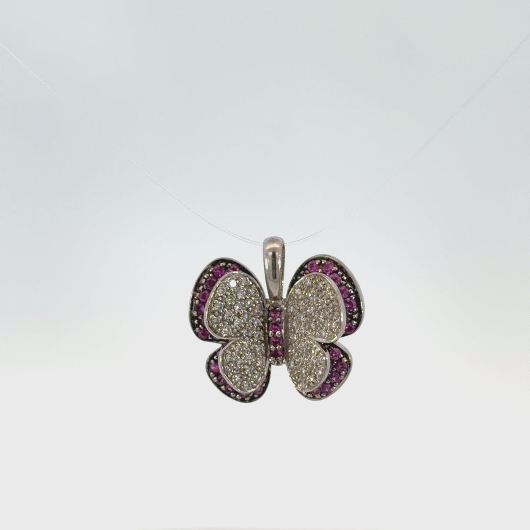One 18Kt white gold diamond & natural pink sapphires pave butterfly pendant containing: