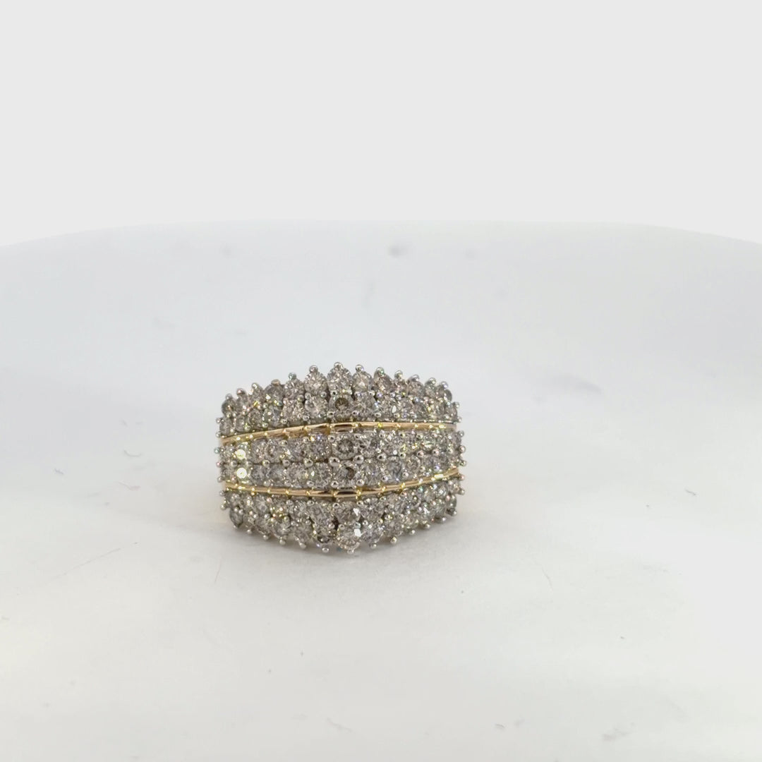 One 10Kt yellow gold 1.79 ctw diamond multi row pyramid style band ring containing: