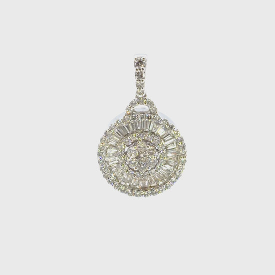 One 14KT white gold 1.16cttw round & baguette cut diamond circle dangle pendant: