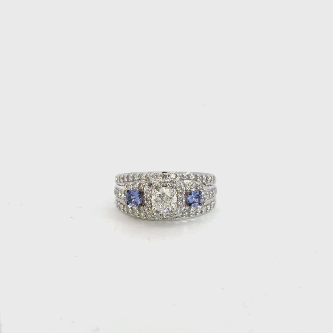 One 10kt white gold diamond & tanzanite three row halo style ring containing: