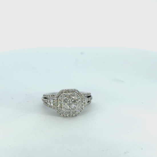 One 14Kt white gold 1.01 cttw round brilliant cut diamond halo cluster engagement ring: