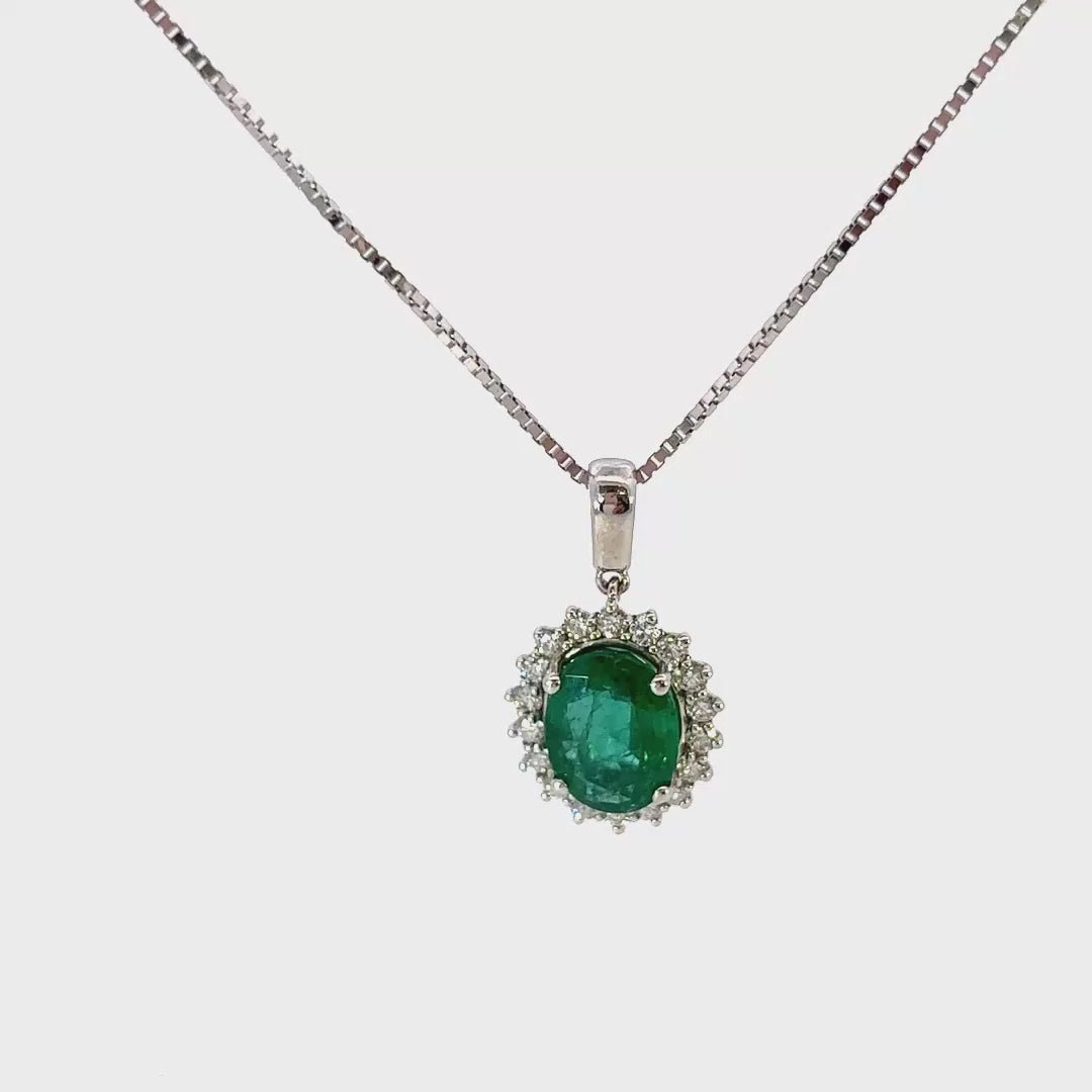 One 14kt white gold diamond & lab grown emerald halo style pendent on 18 in box chain