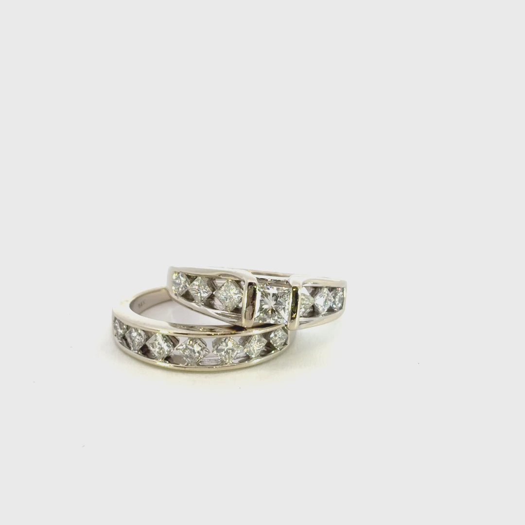 One 14kt white gold 2.09 cttw princess cut diamond bridge style wedding ring set