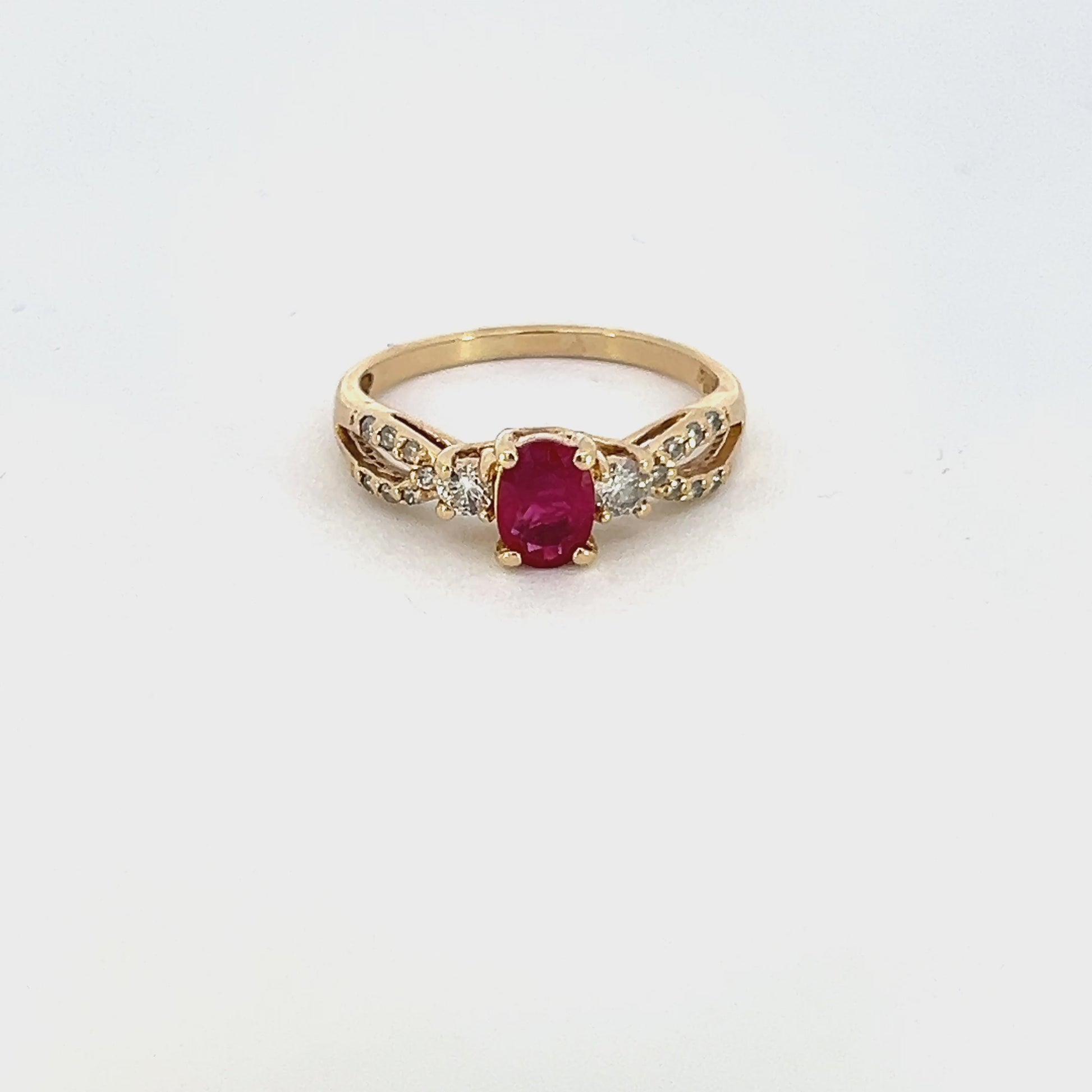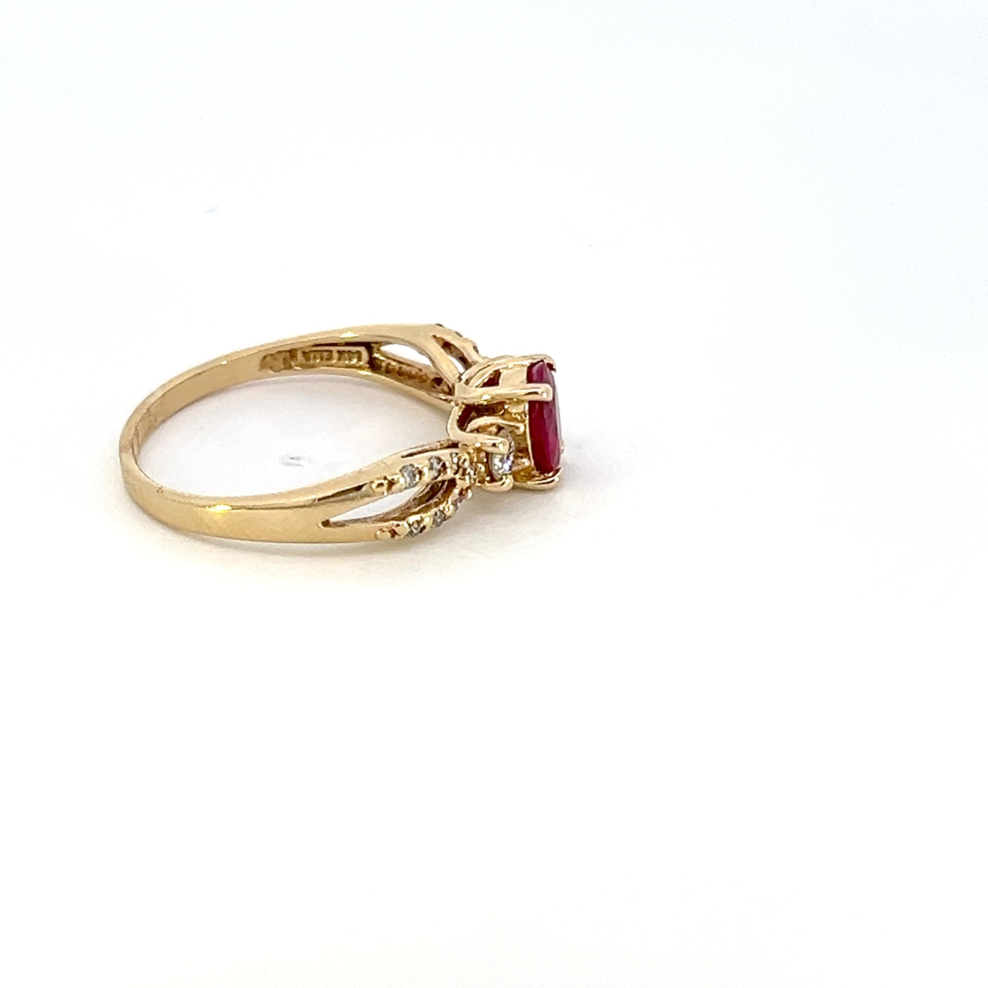 One 14Kt yellow gold diamond & natural ruby split shank style ring containing: