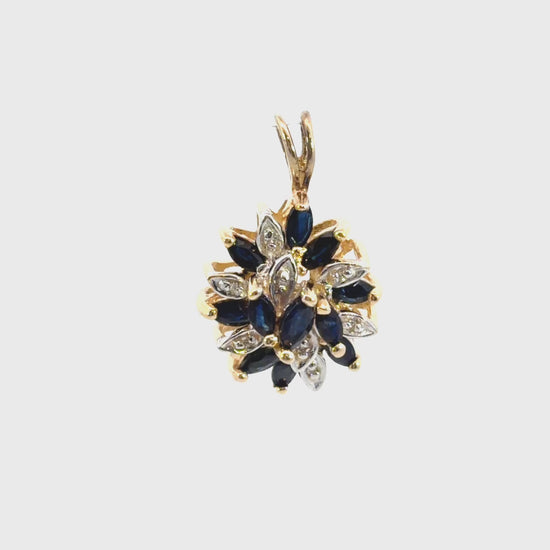 One 14KT yellow gold diamond & marquise cut natural blue sapphire cluster pendant:
