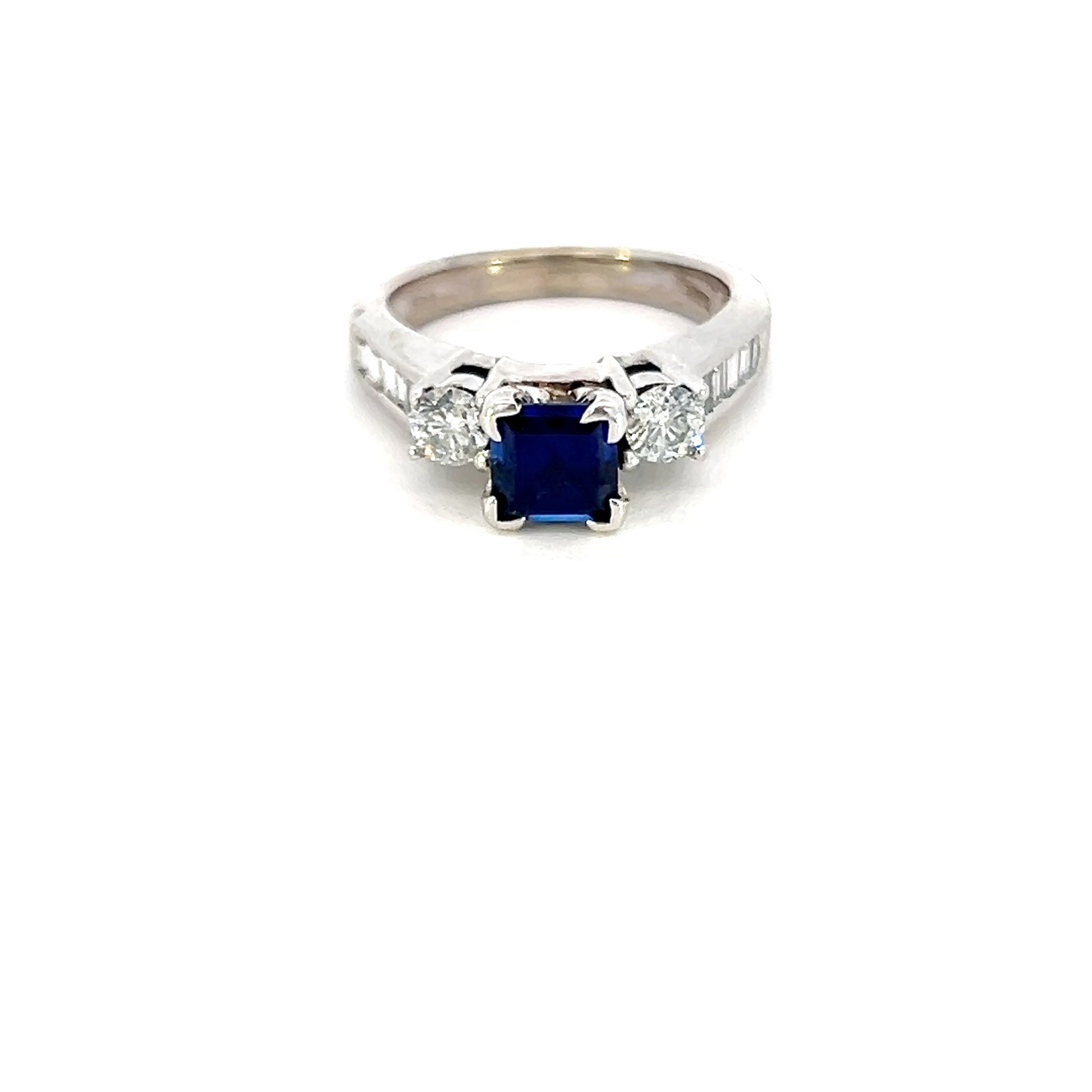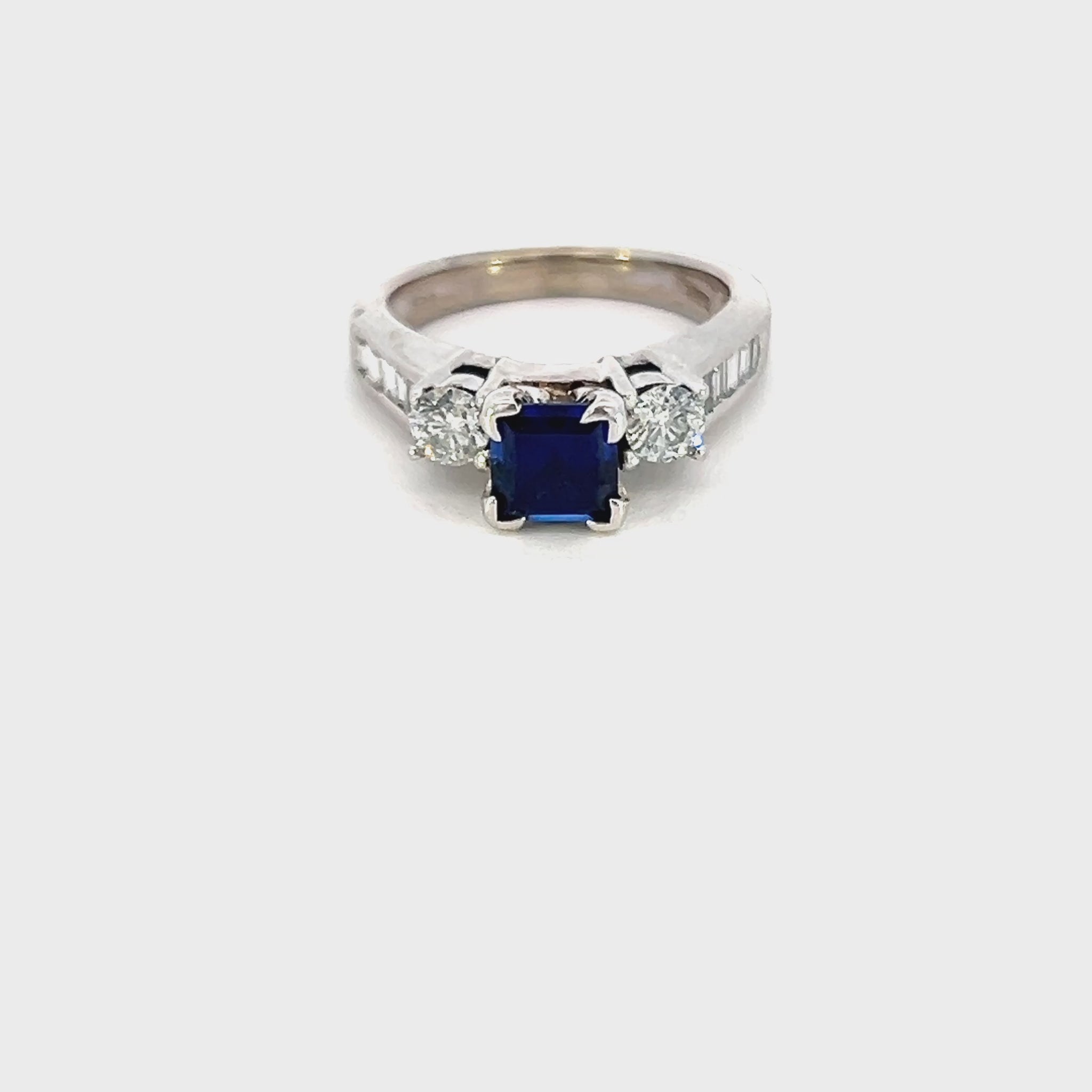 Also set: One lab created blue sapphire weighing 1.43 ct 10 baguette cut diamonds (VS2-SI2, H-J) weighing 0.31 cttw