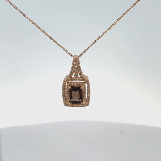 One 14KT rose gold diamond & smoky quartz double halo style pendent on 18in chain: