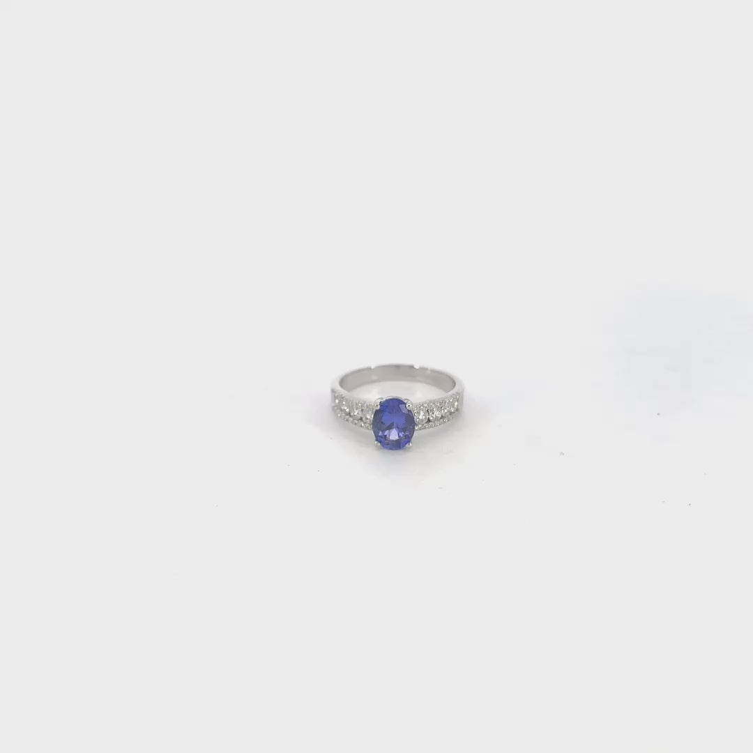 One 14Kt white gold diamond & tanzanite three row band ring containing:
