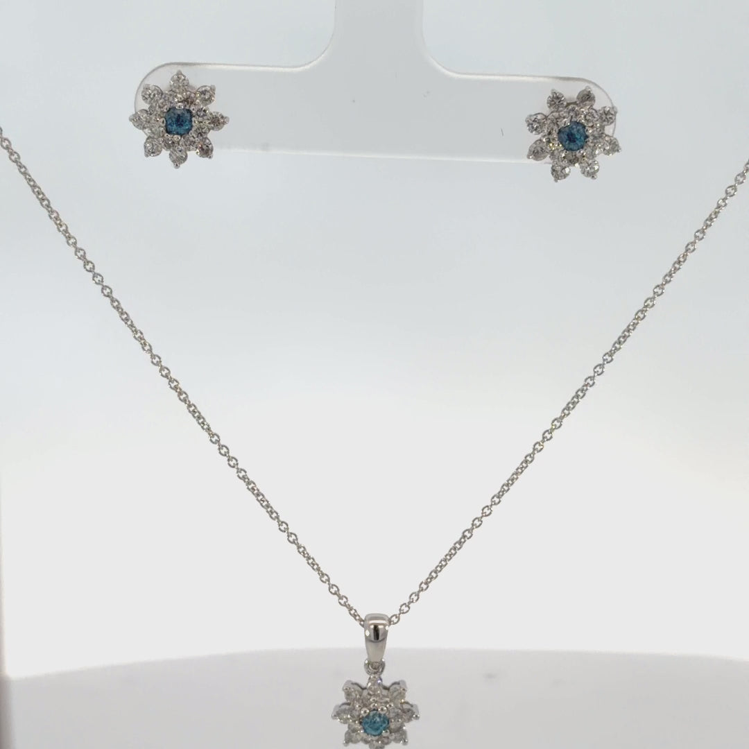 One pair of 14kt white gold 0.76 ctw round cut Fancy Green Blue & white diamond floral motif earrings: